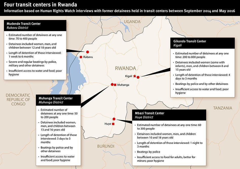 Following a September 2015 Human Rights Watch report on abuses at the Gikondo transit centre, Human Rights Watch interviewed 43 former detainees from Gikondo and three transit centres in other parts of Rwanda: Muhanga (Muhanga district), Mbazi (Huye district), and Mudende (Rubavu district). Most of these interviews took place in 2016.